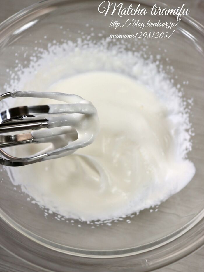 別のボウルに生クリームとグラニュー糖10gを入れて7分立て位にする。