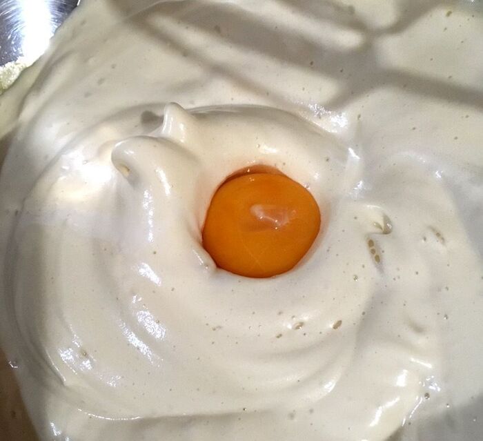 卵黄を1つづつ加え、その都度よく混ぜる。