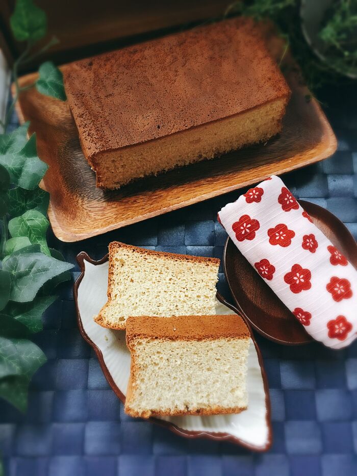 粗熱が取れたら直ぐにラップすると、しっとり感が増して、売り物のカステラのようになります。