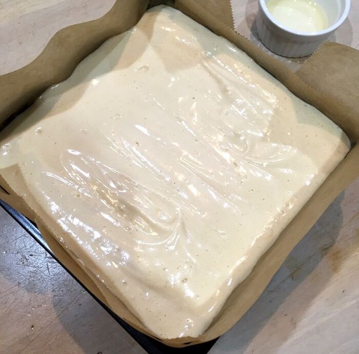 型に生地を流し入れ高いところからトン!と落とし空気を抜く。