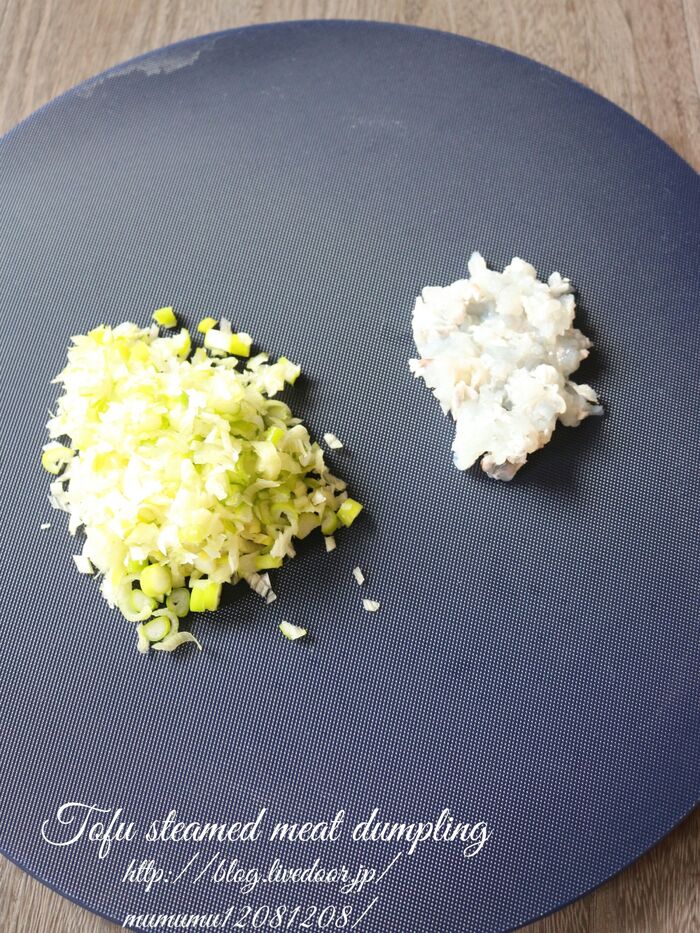 白ネギとエビ、はんぺんと水切りをした豆腐を潰しながら入れ、良く混ぜる。