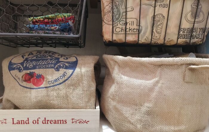 じゃがいもを入れているジュートベジタブルストッカーの下にも、砂対策にセリアの木箱を使っています。