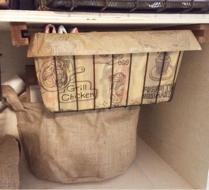 ランチョンマットを入れたアンティークワイヤーバスケットは、切ったインテリアウォールバーに引っ掛けて引き出し式にしました。