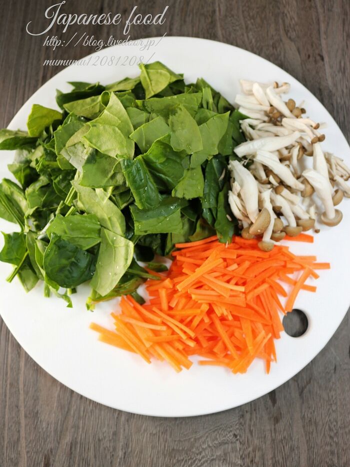 ほうれん草はよく洗い、5センチ位に切る。