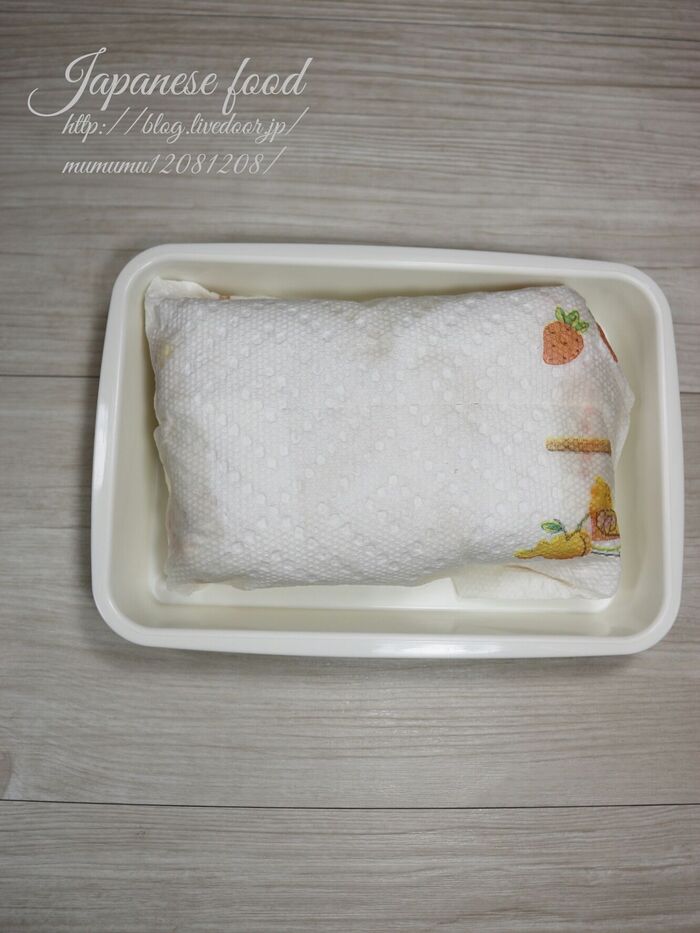 木綿豆腐をキッチンペーパー等に包んで水切りをする。