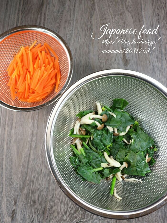 にんじんは千切りにし、しめじは小房に分けておく。