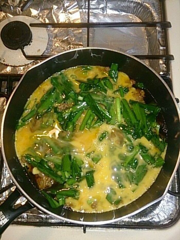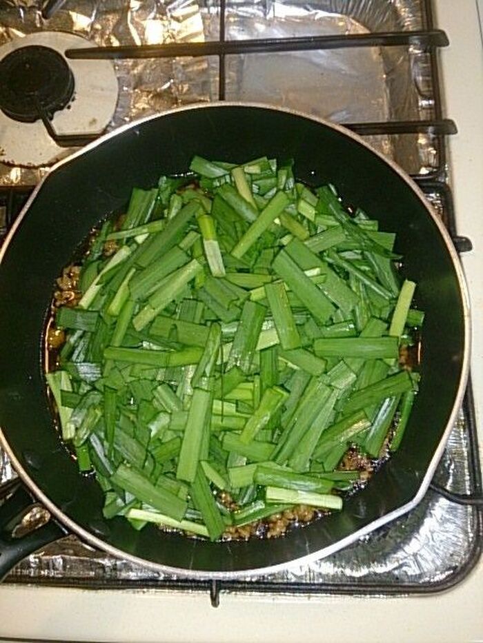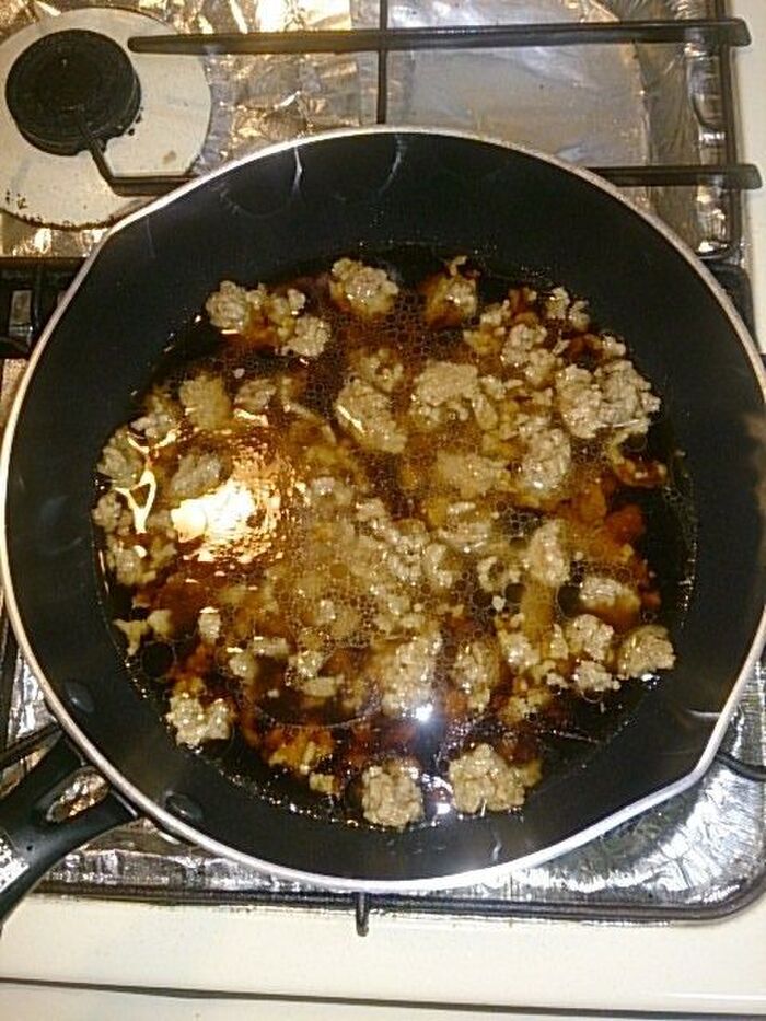 ②フライパンに挽肉を入れて中火で炒め、色が変わってきたら◎を入れる。