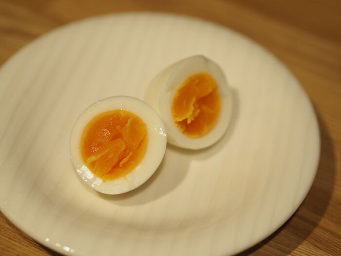 続いてゆで卵を切ってみると、中から理想の半熟状態の黄身が出てきました!固すぎずゆるすぎず、程よい柔らかさで、ここに塩をふって食べればそれだけで大満足です☆