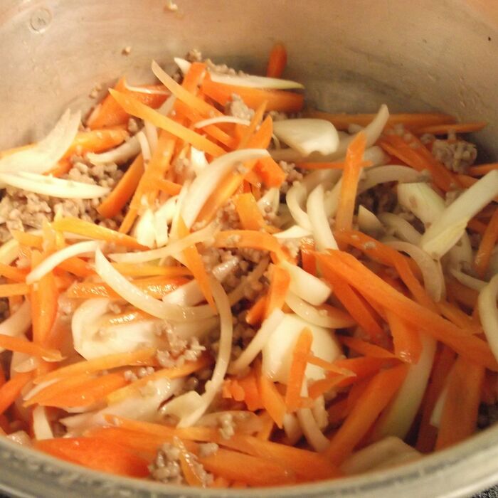 人参と玉ねぎはしっかり柔らかくなるように下側に、