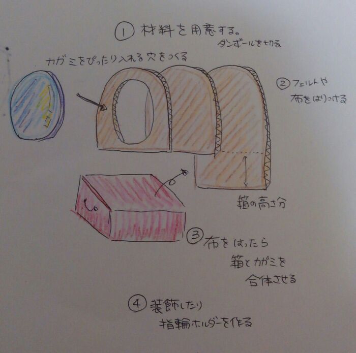 鏡部分の段ボールは3枚重ねにして、一枚は箱に設置、もう一枚は鏡を埋め込むのに、鏡と同じ形を切り抜きます。