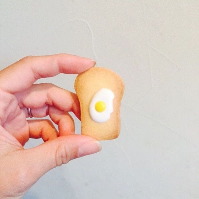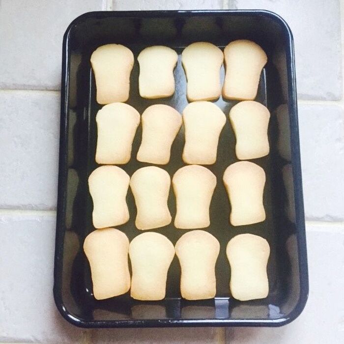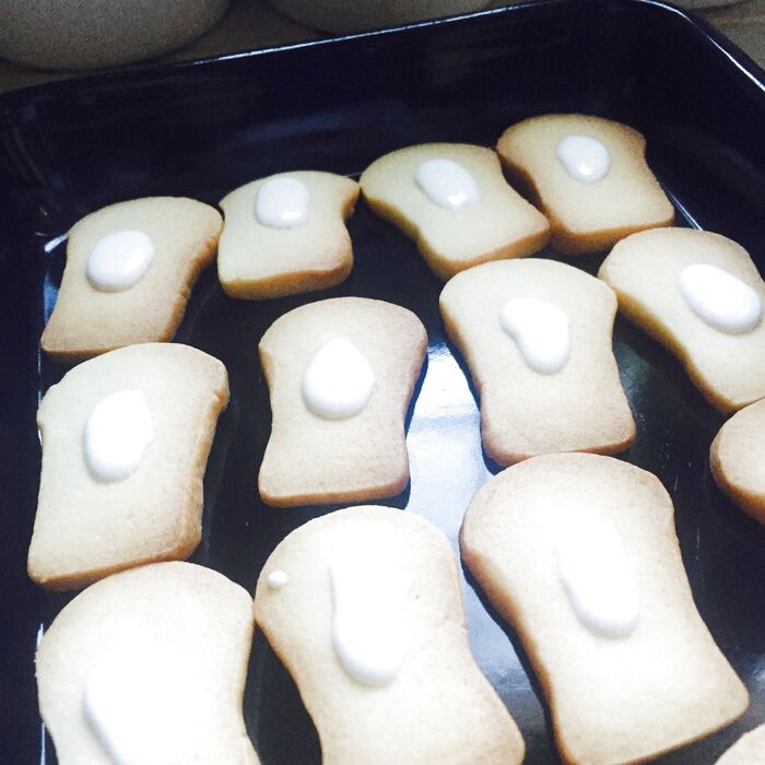 やわらかくなったバターと砂糖を混ぜ、少しずつ溶いた卵を合わせます。振るった薄力粉を切るように混ぜる。クッキーを横からみたら食パンの形になるように形を作って、冷蔵庫で休ませてから、端から細くスライスしていきます。オーブン170℃で約18分~20分焼きます。