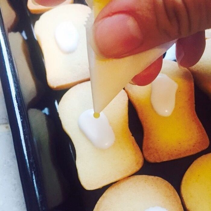黄身の部分は、クッキングペーパーを三角の筒状にたたんで、中に黄色のアイシングをいれ、角を少しだけ切って細く中心に落します。