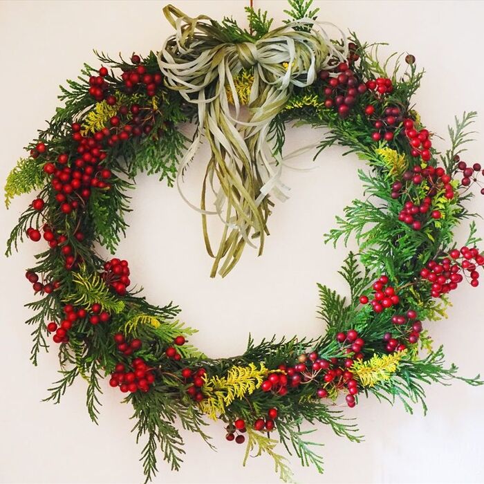 ヒバと山帰来を集めてトラディッショナルなシンプルリースにリメイクしました。山帰来はもともとドライになっていますがヒバはこのままドライになっていきます。