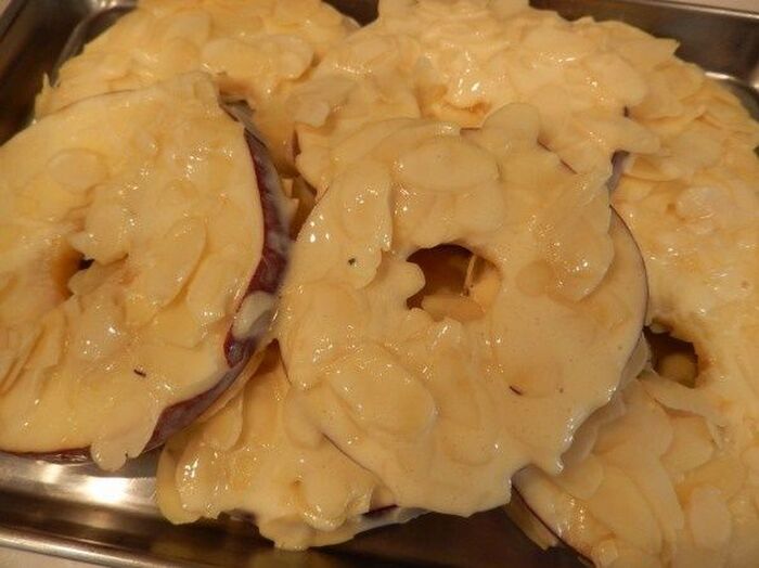 りんごに生地をさっと付け スライスアーモンドを重ならないように全体にまぶす