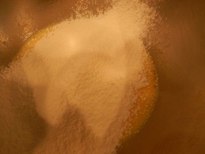 卵白にハチミツを加え軽くメレンゲ状にして生地に混ぜる