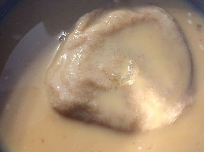 bを混ぜ合わせフレンチトーストの卵液を作りあんこをはさんだ麩を漬けこみよくしみ込ませる