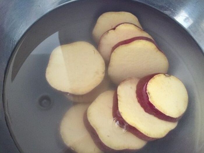 さつまいもは皮付きのまま1cm厚さの輪切りにして