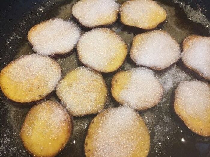 グラニュー糖をふりかけカラメル状にして全体に絡ませシナモンをふる
