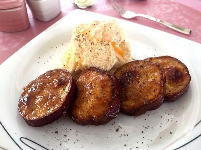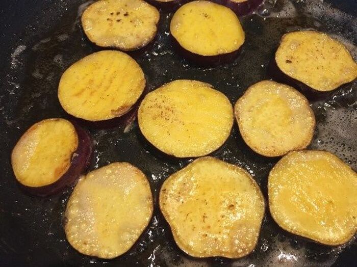 フライパンにバターを溶かし水気をよく切ったさつまいもを入れ両面をこんがりと焼く