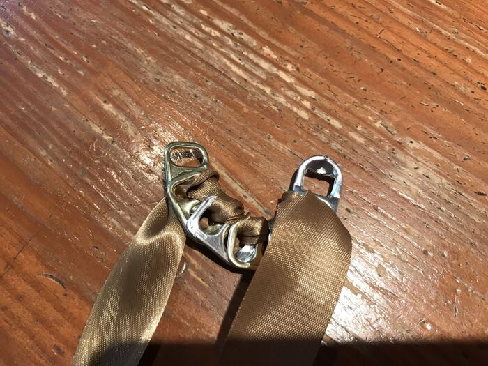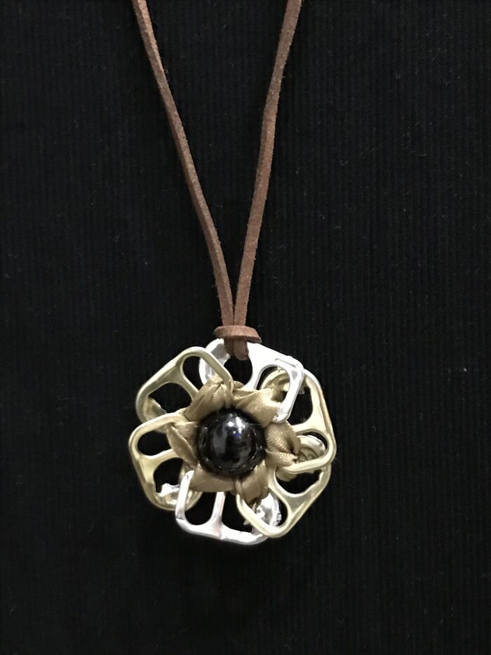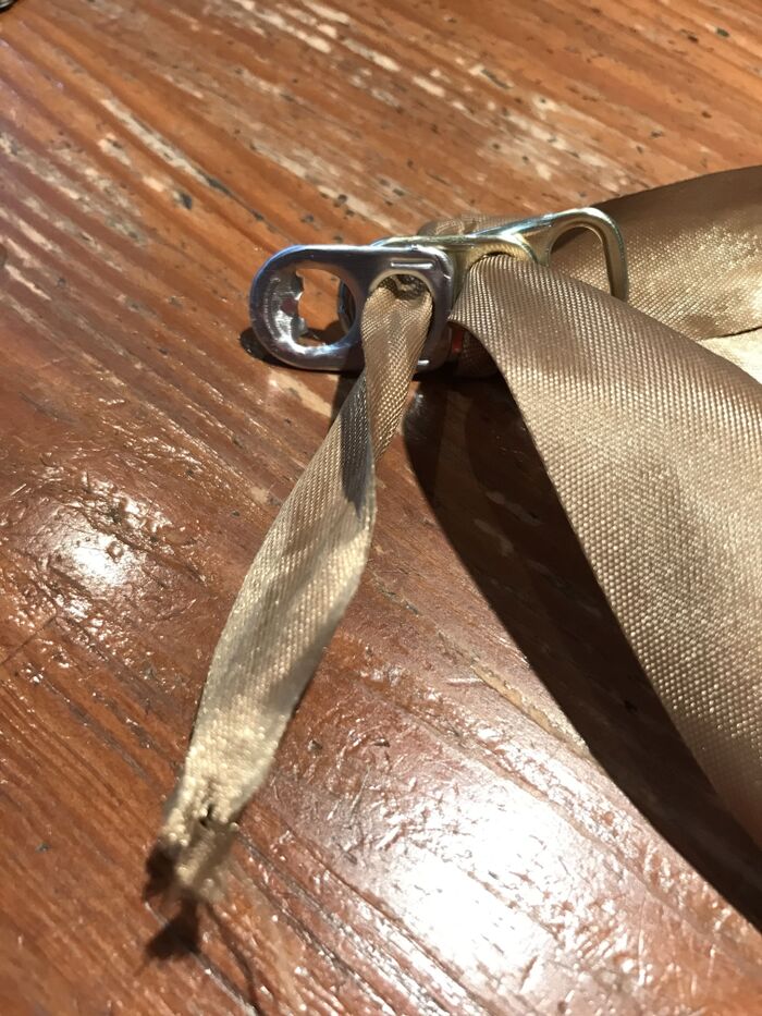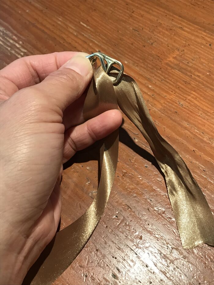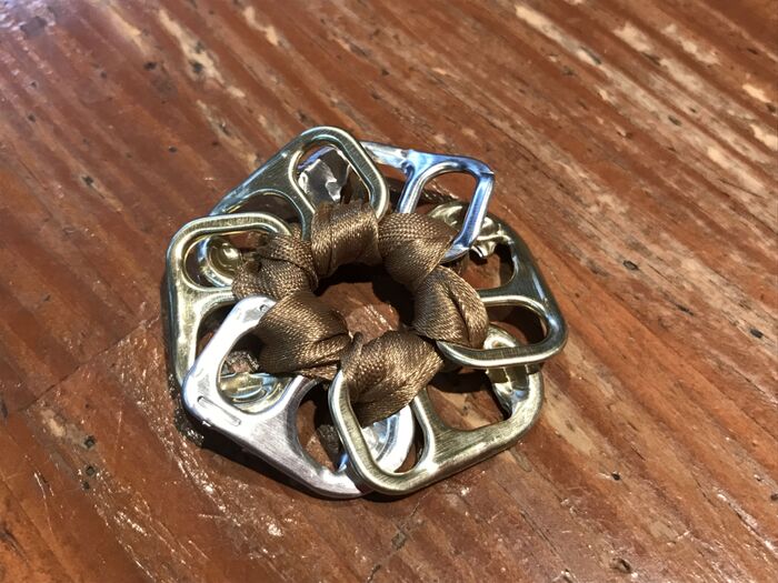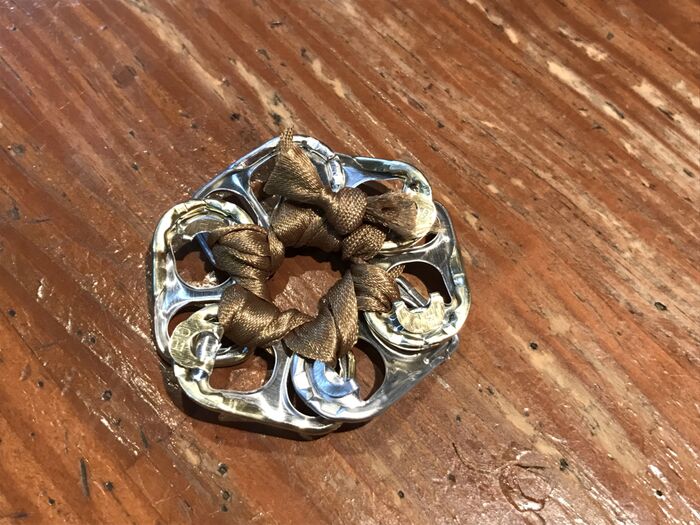 プルタブを写真のように重ねて矢印の部分に裏側からリボンを通します。