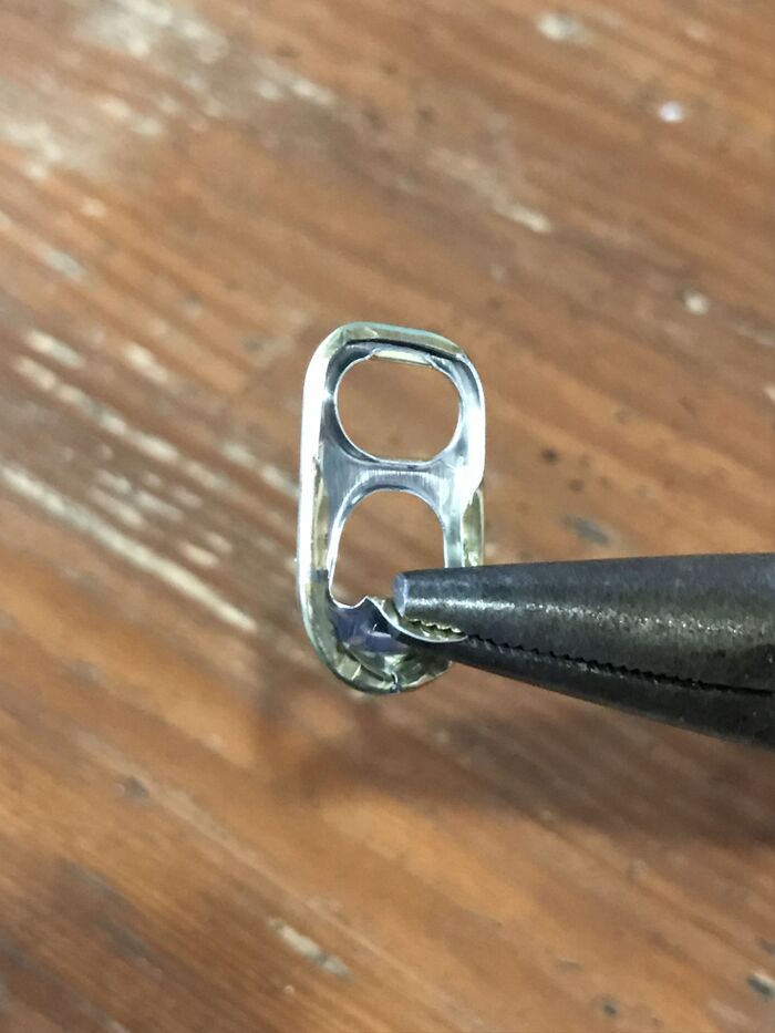 写真のようにラジペンでプルタブの出っ張り部分を折り曲げます。