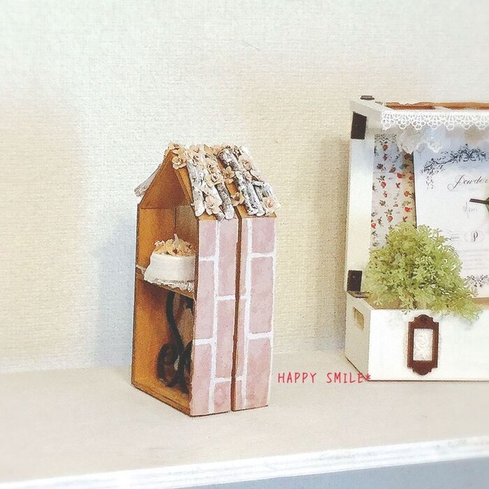 お家型キャビネットの屋根部分に木工ボンドで、小枝を貼ります。