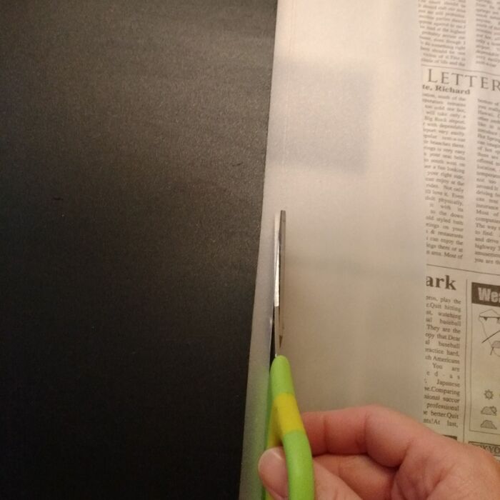 そのため、PPシートの両サイド(390mmの方向)と下部を木材の幅に合わせて2cm弱ずつ残して、黒板シートを貼ります。