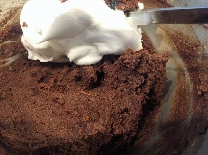 ホイップしたメレンゲを加え混ぜ合わせクッッキングシートをのせた型に入れる