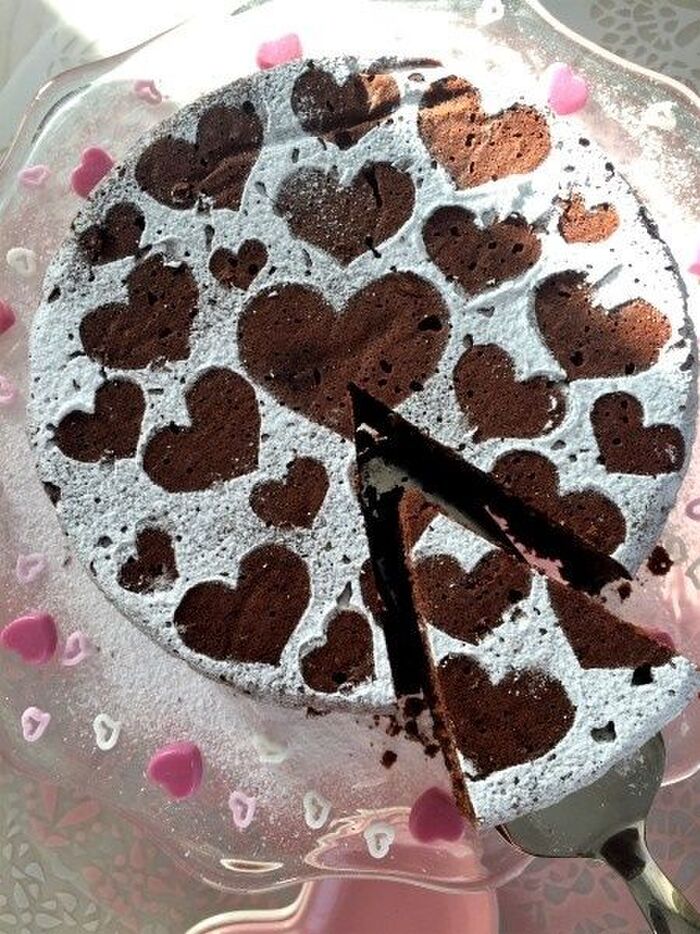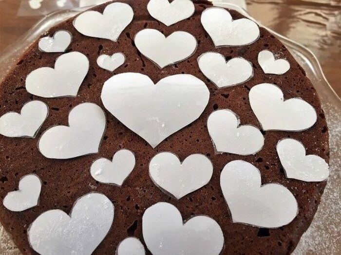 170℃で50分ぐらい焼き粗熱がとれたら型から外し形を整えハートにくり抜いた紙をのせ粉砂糖をたっぷりふる