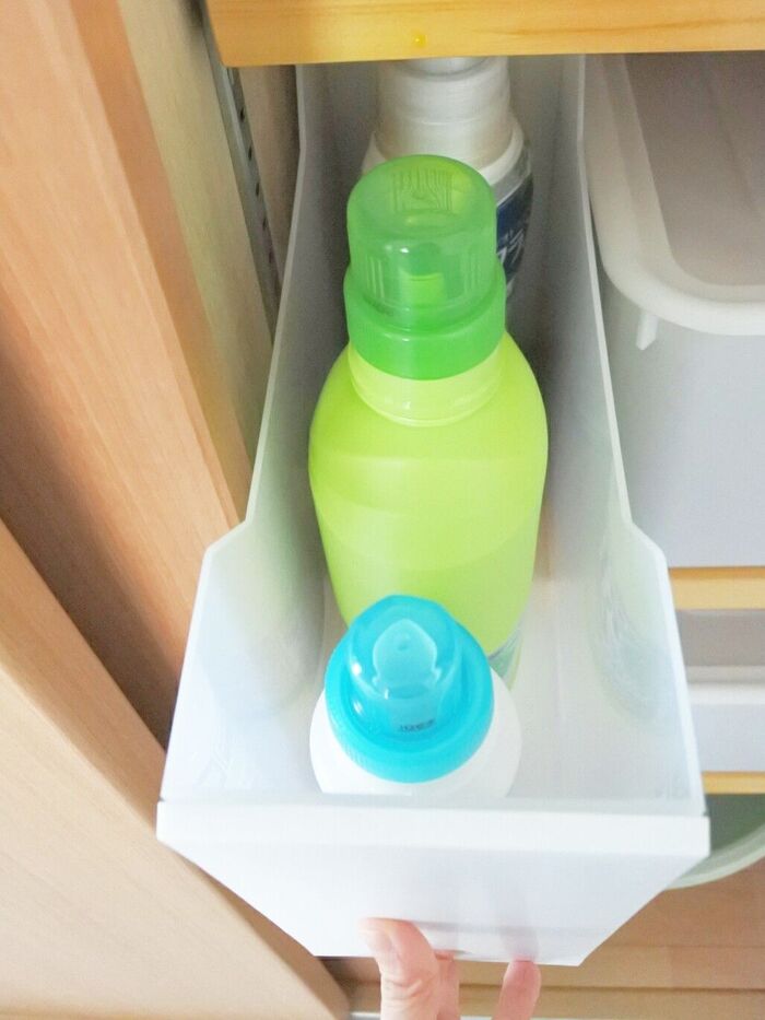 ボトルごと入れてしまうだけなので、ズボラな私にピッタリな収納です
