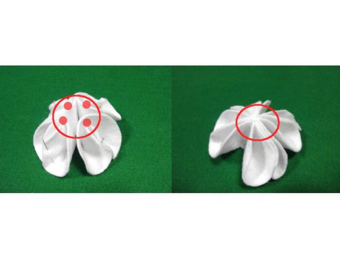 裏に返して、写真(左)の赤点の部分を糸で縫い止めます。