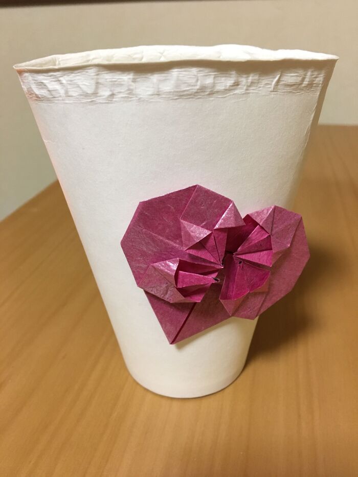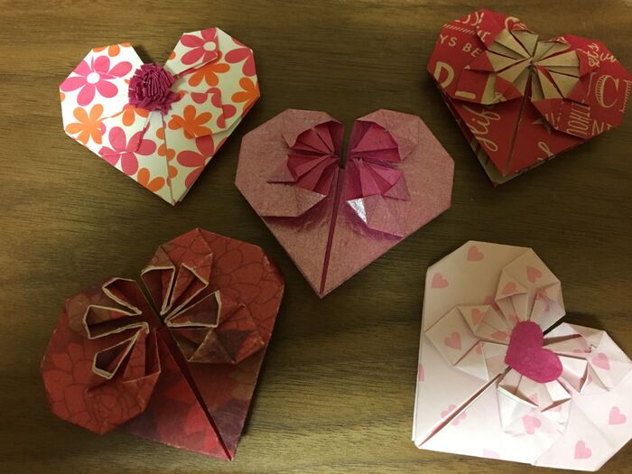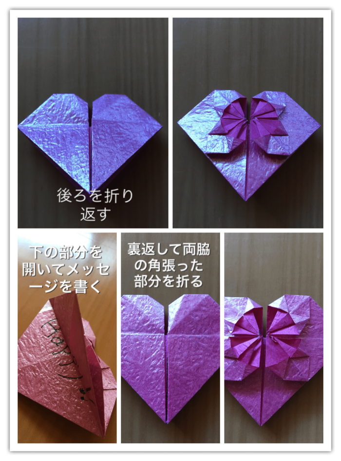 ハートの真ん中部分は折り紙の裏側がでるので、同じ柄にしたい時は折り紙を切らずに半分に折って作れば同じ柄になります。