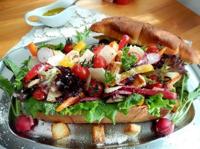 持ち寄りの場合は パン 野菜 ドレッシングをそれぞれ分けて持っていきパーティー会場で盛り付けるといいですね。