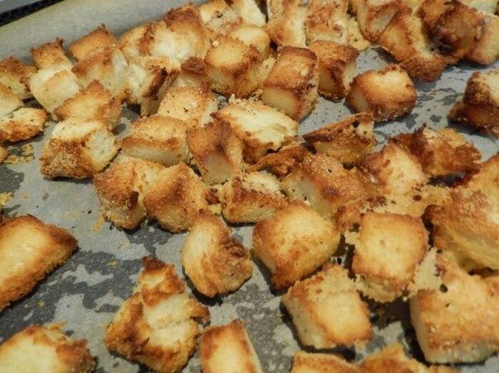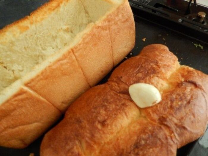 上部とくりぬいた器になるパンはオーブンでカリッとさせるまで焼き半分に切ったにんにくを全体にこすりつけておく