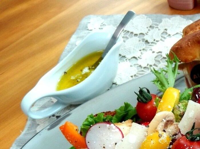 最初にドレッシング全部であえてしまうと水っぽくなってしまうので最低限の量で和えて盛り付けます。食べる時にお好みでドレッシングをかけます。フリルレタスをしくと器のパンがベチャッとしません。