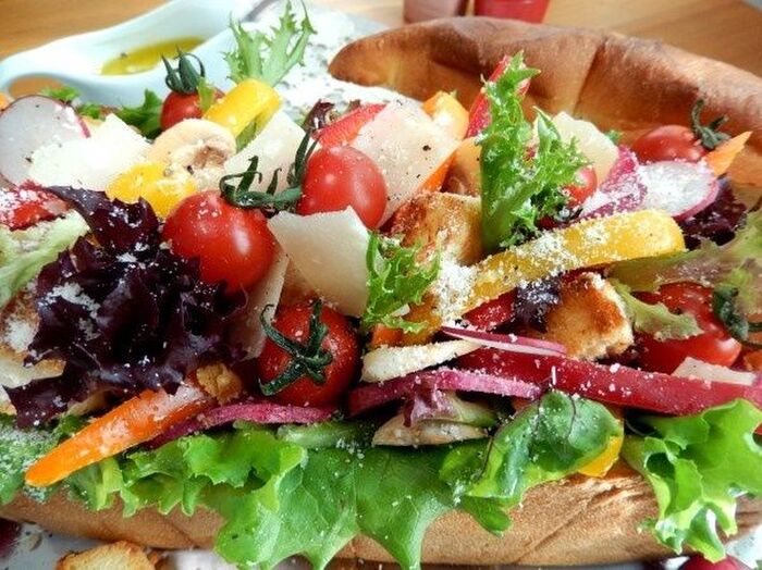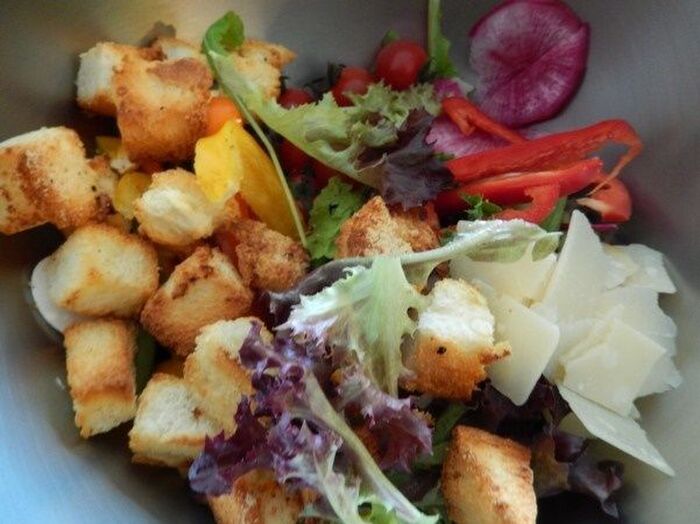 パンの器にフリルレタスを全体に敷いてから4を詰めパルミジャーノと黒コショウをふる