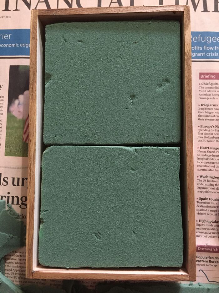 ダイソーのオアシス(フラワーアレンジ用)を半分に切ったサイズがジャストだったので、このように敷き詰めました。