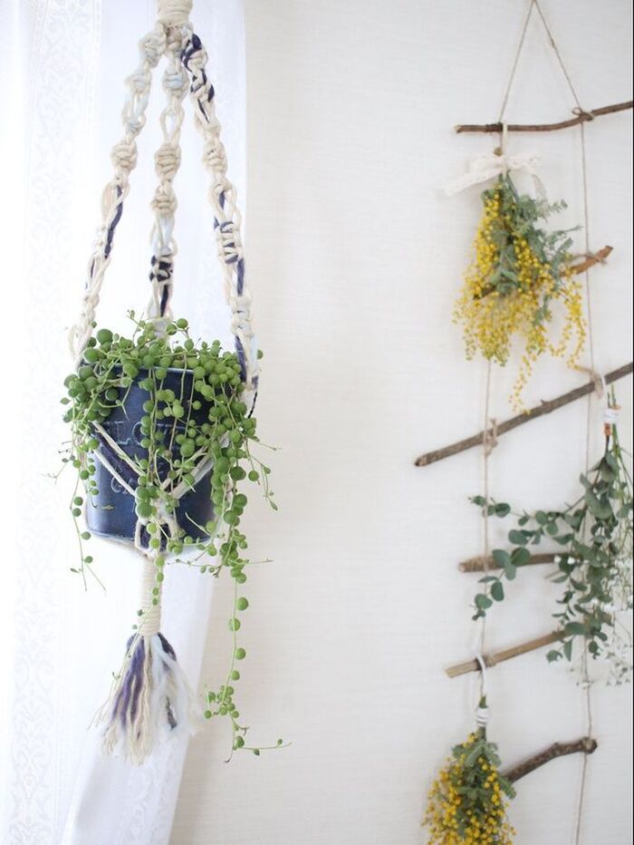 毛糸入りのプランツハンガーもカラー選びで春っぽく見えます。