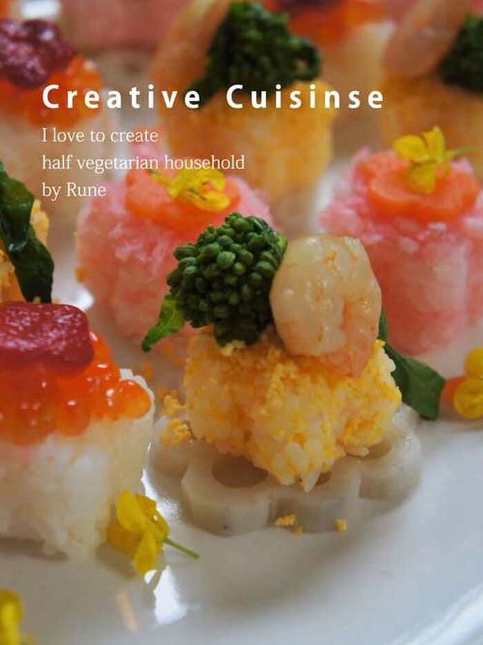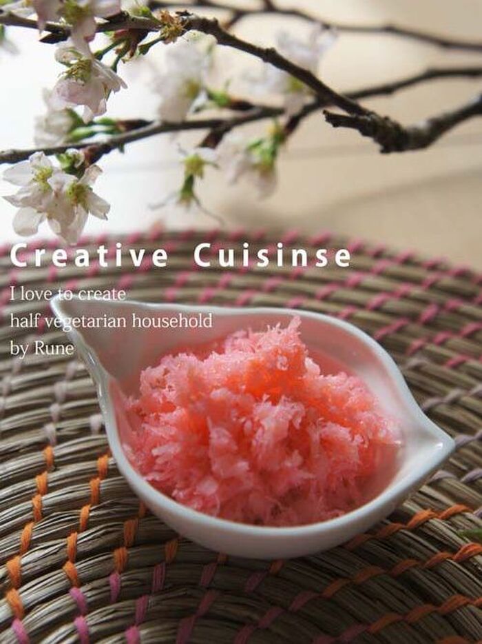 梅の花に型取った酢飯に黄色は黄身、ピンクはデンブを上に向ける面に、残して置いたそれぞれを少しのせる。