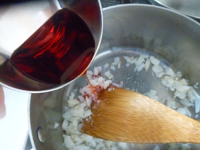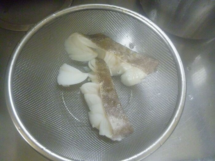 ③(A)を入れて火にかけて水分が無くなるまで、鍋底に鱈の身が少しくっつく程度になるまで炒る。