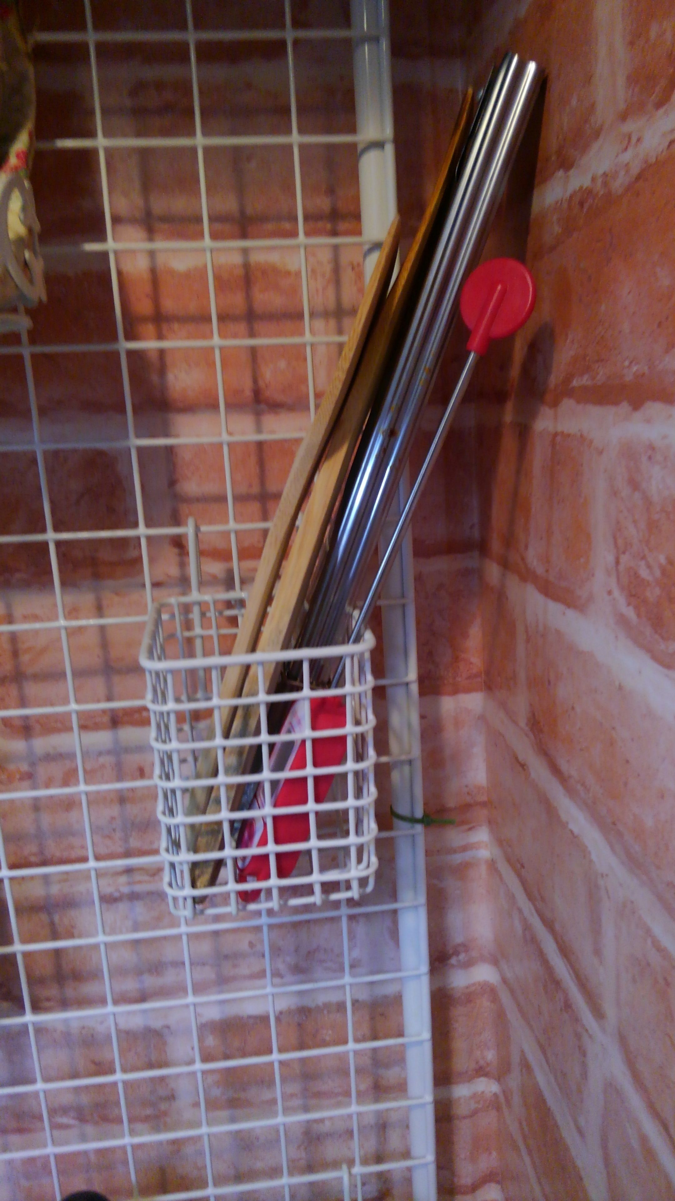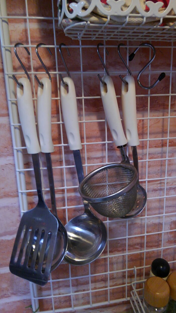 コンロの奥なので、私はS字フックによく使うお玉や味噌漉し、フライ返しをぶら下げてます。