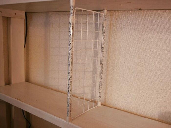 本棚と同じ木材を使って板で間仕切った方が安定していて見栄えもいいのでしょうが、板をねじで固定するのも大変だし、置く物が変わったらまた間仕切りを変えなくはいけません