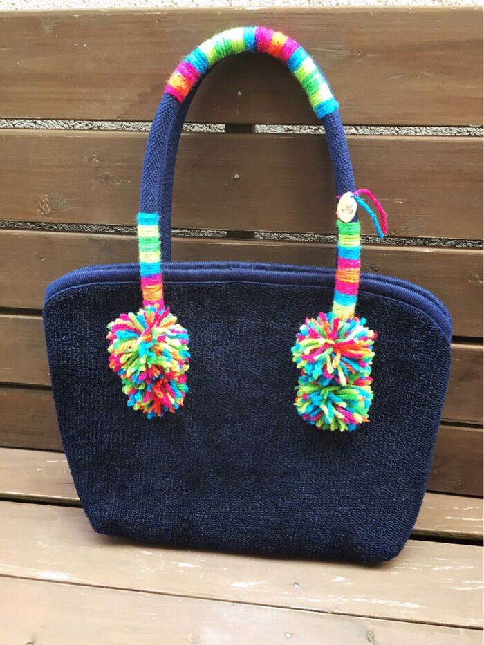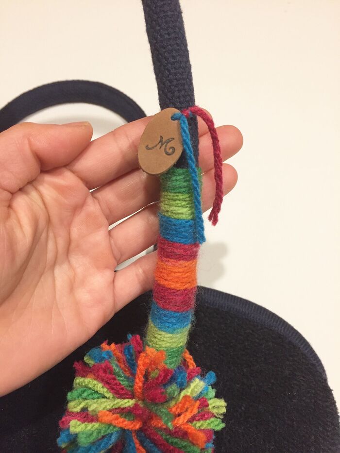 ボンボンについた長い毛糸を、カバンの持ち手に固定します。