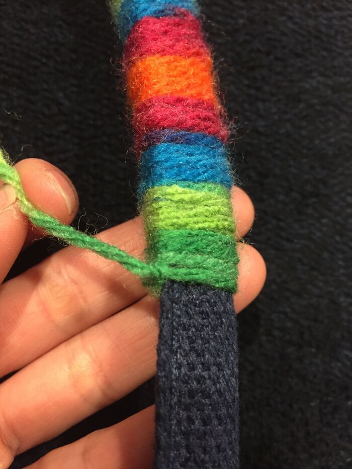 持ち手の周りに毛糸をくるくると巻きつけていきます。