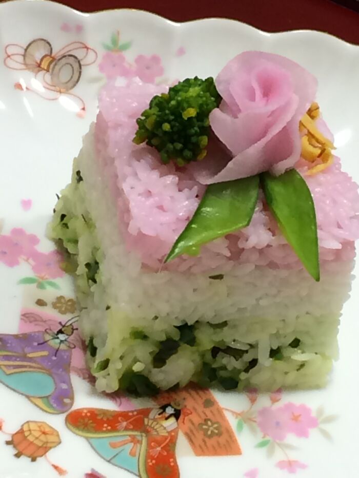 ピンクご飯、ラップで作った小さなおにぎり5個並べるだけで、可愛い御膳になります。(花芯は錦糸卵〕