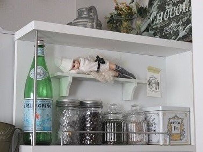 賃貸住宅の壁に釘打ちはご法度だけど、この食器棚はyukinocafeさんのだから、しっかりネジ型の釘打ち込んで固定しといたわ!あのガラス瓶、置けるわよ~」