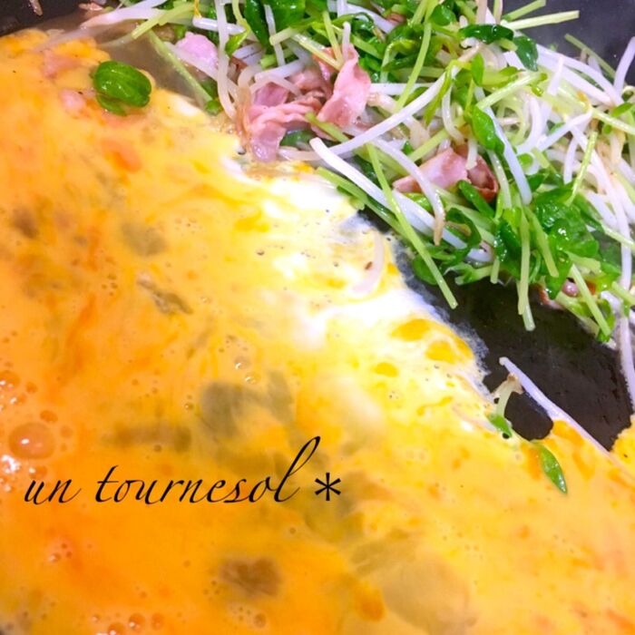 豆苗ともやしをいれて炒め、少ししなっとなったら、端に寄せて②をいれてスクランブルエッグをつくる。《中火》