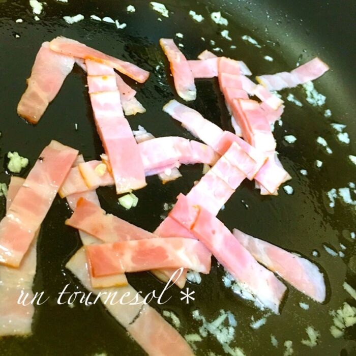 フライパンにオリーブオイルとにんにくを入れて熱し、香りがでたらベーコンがカリッとなるように炒める。《弱火→中火》