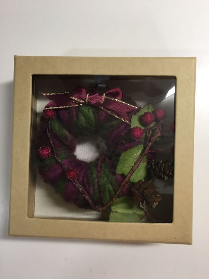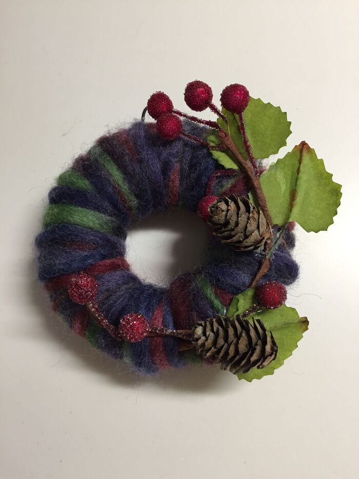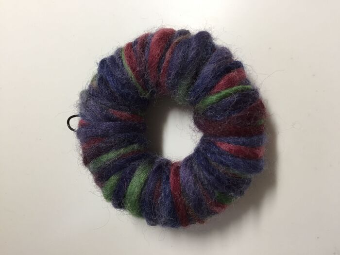 毛糸の太さや好みにもよりますが、100均の毛糸だと2個弱ぐらいで、良い感じのリースが出来上がります。巻き終わった毛糸の先は、中に押し込みます。緩んでくるようであれば、ボンドなどで留めて下さい。