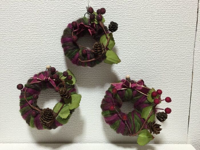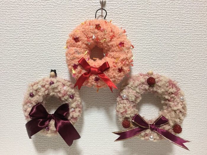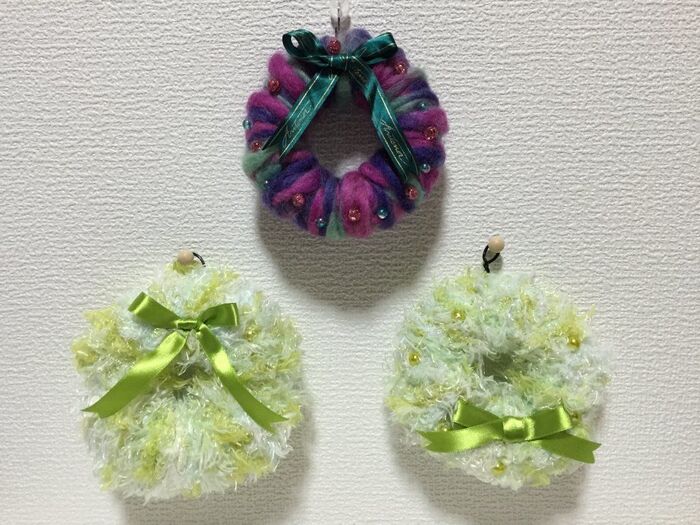 色々な毛糸で作ってみました。アレンジメントピックだけではなく、リボンやビーズなどでもアレンジし放題です。